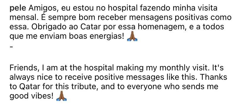 En este contexto, el exdelantero de la Selección de Brasil habló por primera vez desde el hospital para llevarle tranquilidad a los fanáticos. "Amigos, estoy en el hospital haciendo mi visita mensual". Además, agradeció los homenajes que le están rindiendo en la sede del Mundial: "Siempre es lindo recibir mensajes positivos como este. Gracias a Qatar por este homenaje, ya todos los que me mandan buenas vibras", escribió.