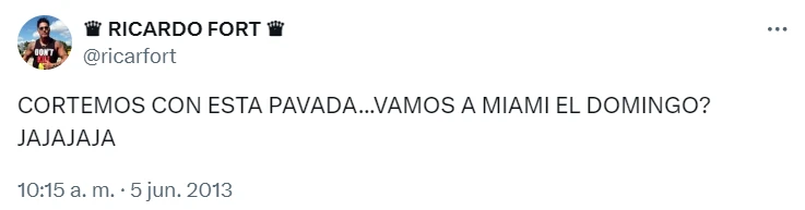 Luego de varios partidos, finalmente Argentina pasó a la gran final de la Copa América 2024. Por lo que, el domingo jugará en el Hard Rock Stadium ubicado en Miami Gardens, Florida. En este contexto, en las últimas horas se comenzó a viralizar un tuit de Ricardo Fort del 5 de junio de 2013, en el que hacía referencia a viajar a la ciudad estadounidense, con la que tanto se lo relacionó.