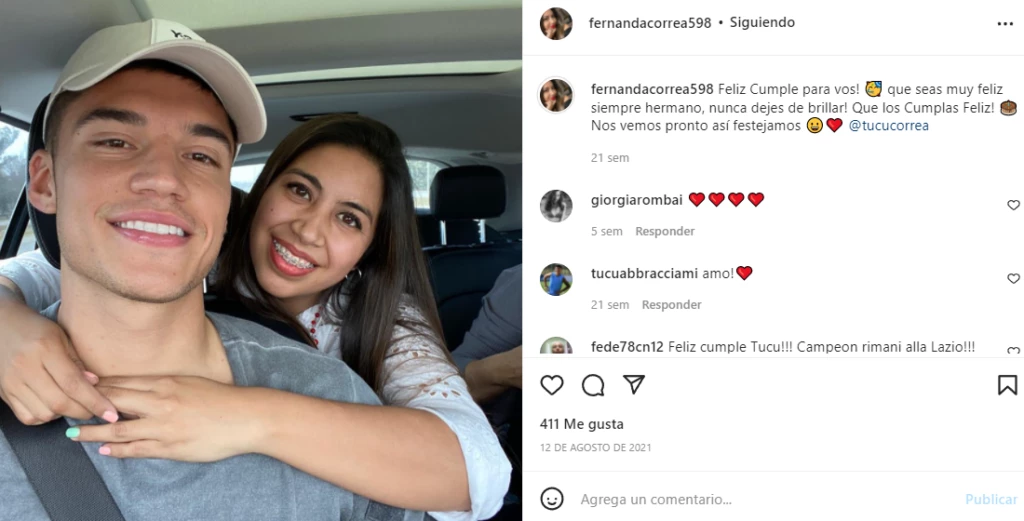 La humildad y cariño de Joaquín Correa son evidentes en cada publicación de su hermana a quien apoya desde lejos y siempre deja algún comentario sincero de corazón, “te extraño”, “Siempre juntos”, “Te amo hermana, gracias”.