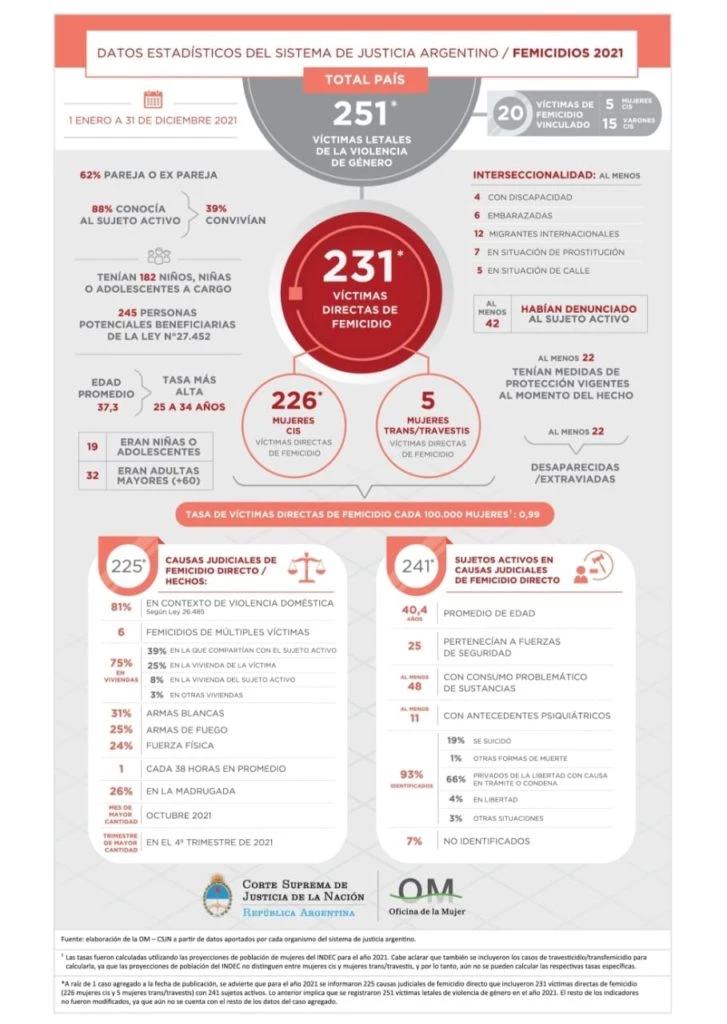 Con una intervención del Gobierno en políticas de género por primera vez en dos siglos de historia pudo conocerse a ciencia cierta cuantas víctimas letales hubieron por violencia de género en un año. En el 2021 se contabilizaron, según datos estadísticos del sistema de justicia argentino, 251 muertes por esta problemática social, de las cuales 231 fueron víctimas directas. Desglosando aún más los números se determinó que 226 fueron mujeres cis y 5 mujeres trans/ travestis.