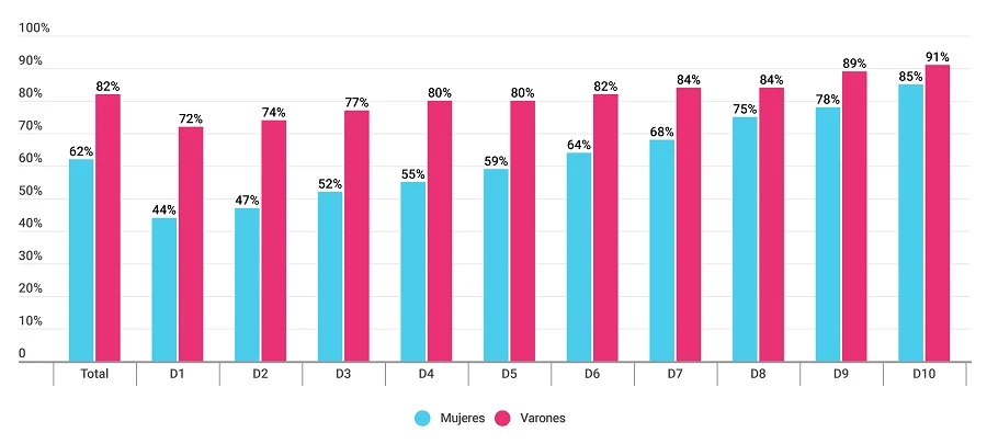 En Argentina solo el 62% de las mujeres en edad de trabajar participan del mercado laboral, en comparación al 81% de los varones (INDEC, 2018). La diferencia en la tasa de actividad entre los géneros es aún más amplia al observar la situación de algunos grupos en particular. En los sectores de mayor nivel socioeconómico, por ejemplo, las mujeres participan casi a la par que los varones; sin embargo, en los sectores de menores ingresos la brecha asciende a 28 puntos porcentuales.