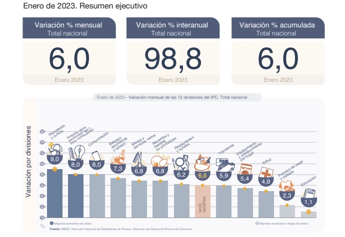 El Instituto Nacional de Estadística y Censos (INDEC) comunicó que el Índice de Precios al Consumidor (IPC) registró un aumento del 6%. La división de mayor crecimiento en el mes fue Recreación y cultura (9,0%), principalmente por la incidencia que tuvo el aumento de los servicios de turismo a raíz de la temporada de vacaciones, y del servicio de televisión por cable.