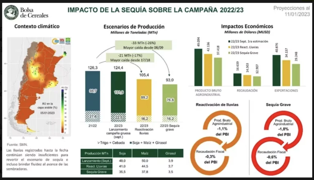 El detallado reporte indica que “el impacto negativo de la sequía con relación a las proyecciones de septiembre es equivalente al 1,1% o 1,8% del PBI, según sea el escenario”.