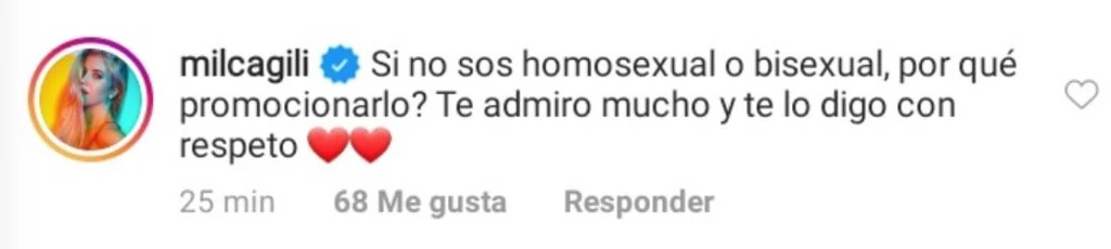 Por supuesto, la cosa no quedó ahí. Enseguida comenzaron a llover los comentarios a favor y también algunas críticas. Desde Emir Abdul declarando: "Botón de que nunca me imaginé esto", hasta Martín Garabal preguntando por el cuadro que se ve en el fondo de la grabación, pasando por el cuestionamiento de Milca Gili: "Si no sos homosexual, por qué promocionarlo? Te admiro mucho y te lo digo con respeto".