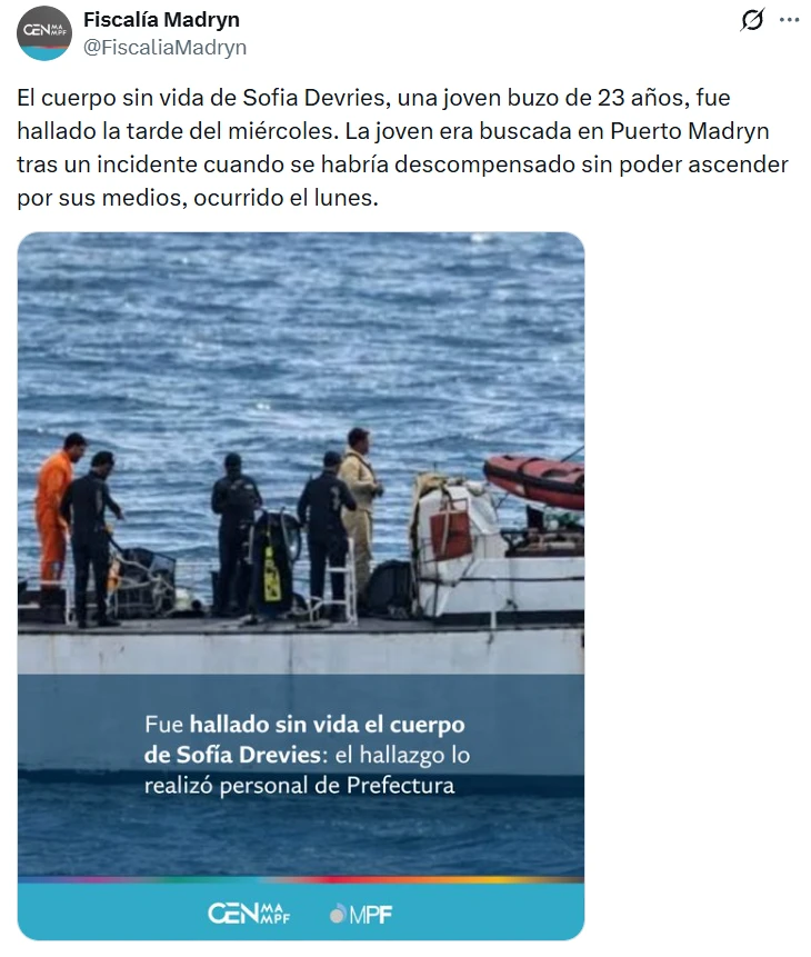 “El cuerpo sin vida de Sofía Devries, una joven buzo de 23 años, fue hallado la tarde del miércoles. La joven era buscada en Puerto Madryn tras un incidente cuando se habría descompensado sin poder ascender por sus medios, ocurrido el lunes”, informaron desde el Ministerio Público Fiscal.