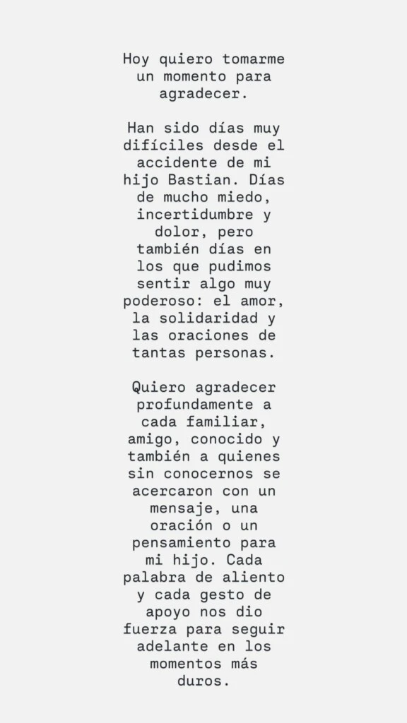“Hoy quiero tomarme un momento para agradecer. Han sido días muy difíciles desde el accidente de mi hijo Bastián. Días de mucho miedo, incertidumbre y dolor, pero también días en los que pudimos sentir algo muy poderoso: el amor, la solidaridad y las oraciones de tantas personas”, escribió en su primer mensaje.