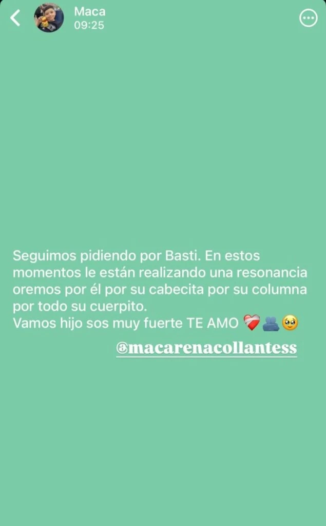 Este jueves 22 de enero, además, la mujer compartió un nuevo y conmovedor pedido mientras su hijo era sometido a estudios médicos. “Seguimos pidiendo por Basti. En estos momentos le están realizando una resonancia. Oremos por él, por su cabecita, por su columna y por todo su cuerpito. Vamos hijo, sos muy fuerte. Te amo”, escribió, reflejando la angustia y la esperanza que atraviesa a la familia.