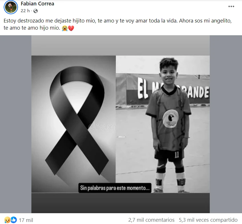 “Estoy destrozado, me dejaste hijito mío, te amo y te voy a amar toda la vida. Ahora sos mi angelito, te amo, te amo hijo mío”, fueron las palabras que escribió el hombre en la red social Facebook junto a una foto de su hijo con su conjunto deportivo y una banderita negra de luto.