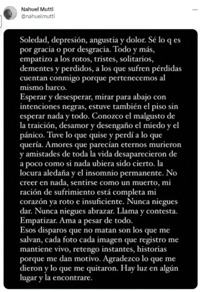 “Tuve lo que quise y perdí lo que quería. Amores que parecían eternos murieron y amistades de toda la vida desaparecieron de a poco como si nada hubiera sido cierto.La locura aledaña y el insomnio permanente”, indicó.