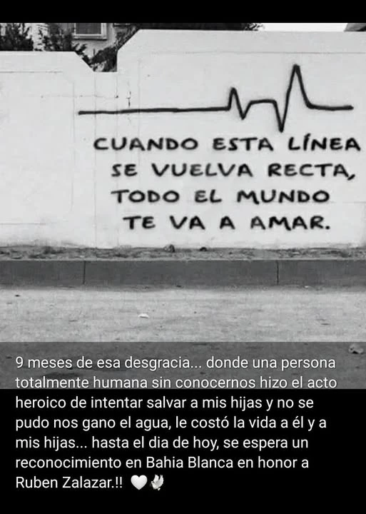 En otra publicación, Haag volvió a resumir la magnitud de la tragedia: “9 meses de esa desgracia donde una persona totalmente humana sin conocernos hizo el acto heroico de intentar salvar a mis hijas y no se pudo. Nos ganó el agua, le costó la vida a él y a mis hijas… Hasta el día de hoy se espera el reconocimiento a Rubén Salazar en Bahía Blanca”.