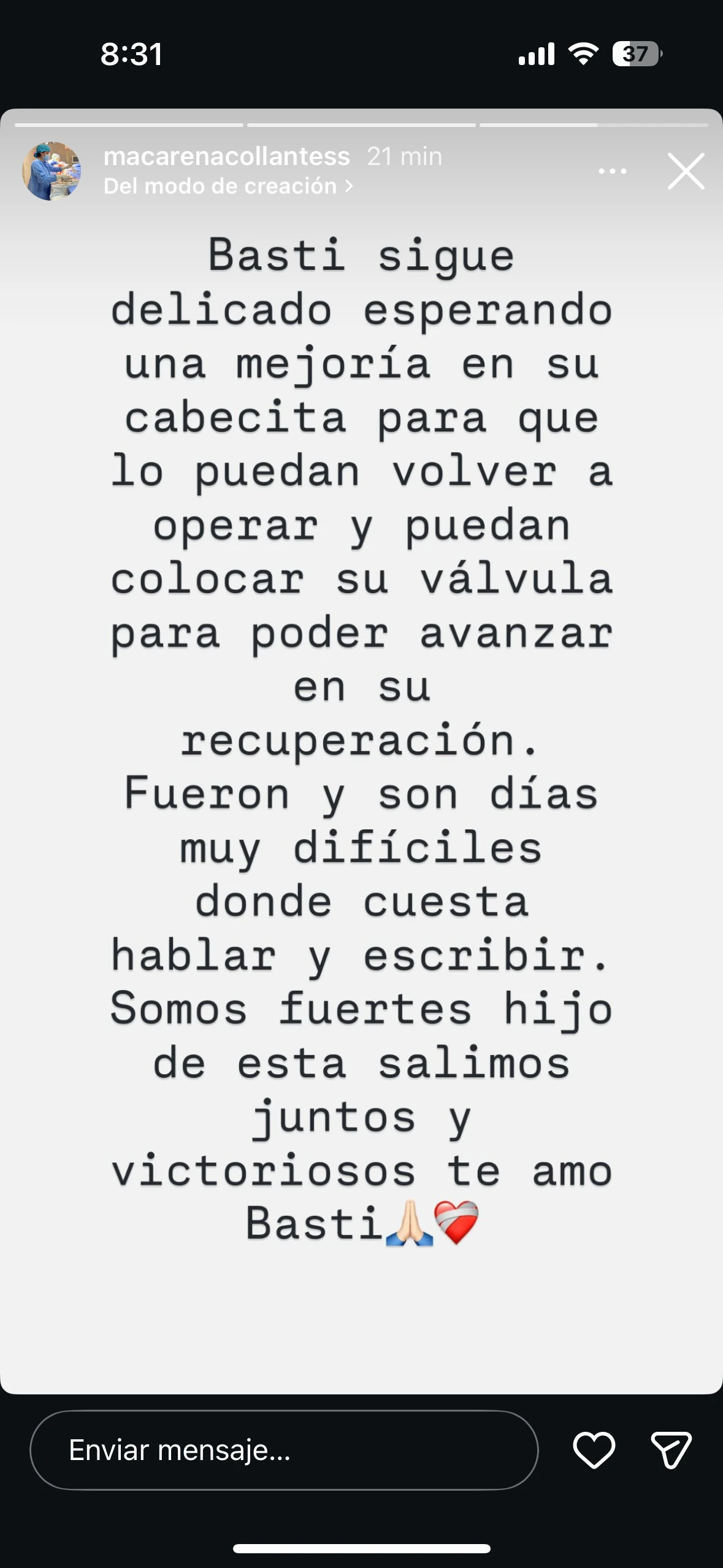 En su mensaje, Macarena también hizo referencia al difícil momento que atraviesa la familia: “Fueron y son días muy difíciles donde cuesta hablar y escribir”, expresó, reflejando el impacto emocional que implica la internación y la incertidumbre frente al estado de salud de su hijo.