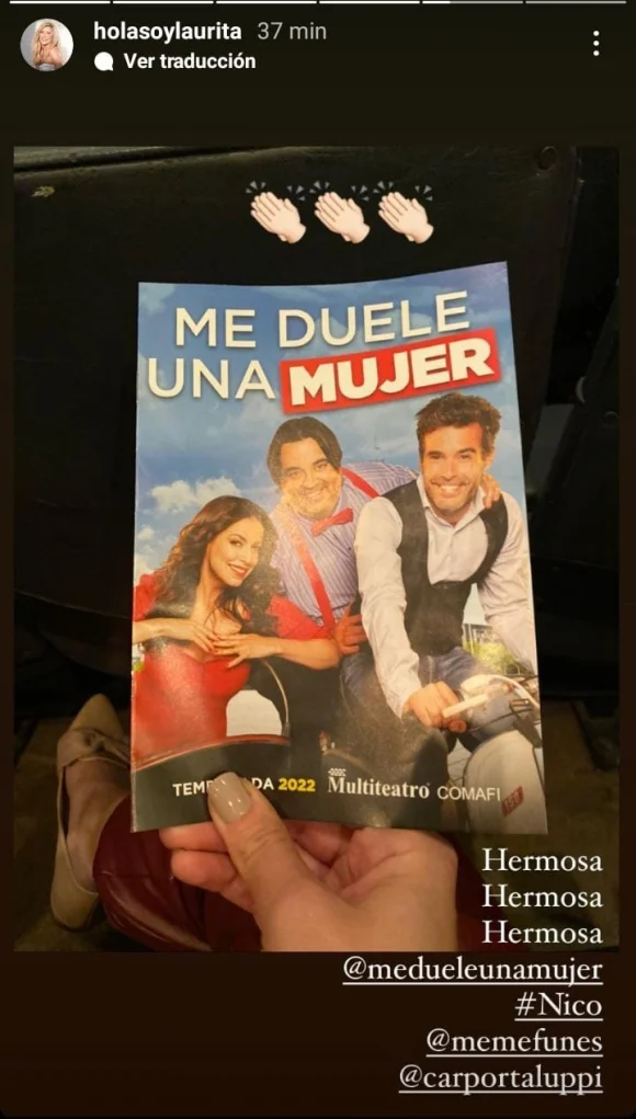 "Hermosa Me duele una mujer. Mercedes Funes, Carlos Portaluppi y Nico", escribió la conductora de Bienvenidos a Bordo, acompañado por una foto del panfleto. Al parecer, la historia cautivó a la bailarina y no pudo evitar compartir su review.