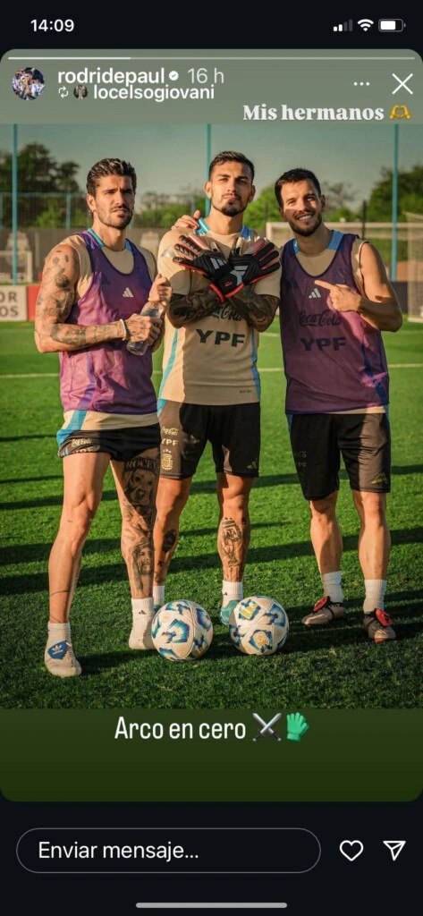 A pocas horas de este gran momento, Rodrigo De Paul compartió un entrañable mensaje para dos jugadores: Leandro Paredes y Giovani Lo Celso. "Mis hermanos", escribió el jugador en una historia de su cuenta de Instagram con una foto de los 3 juntos.