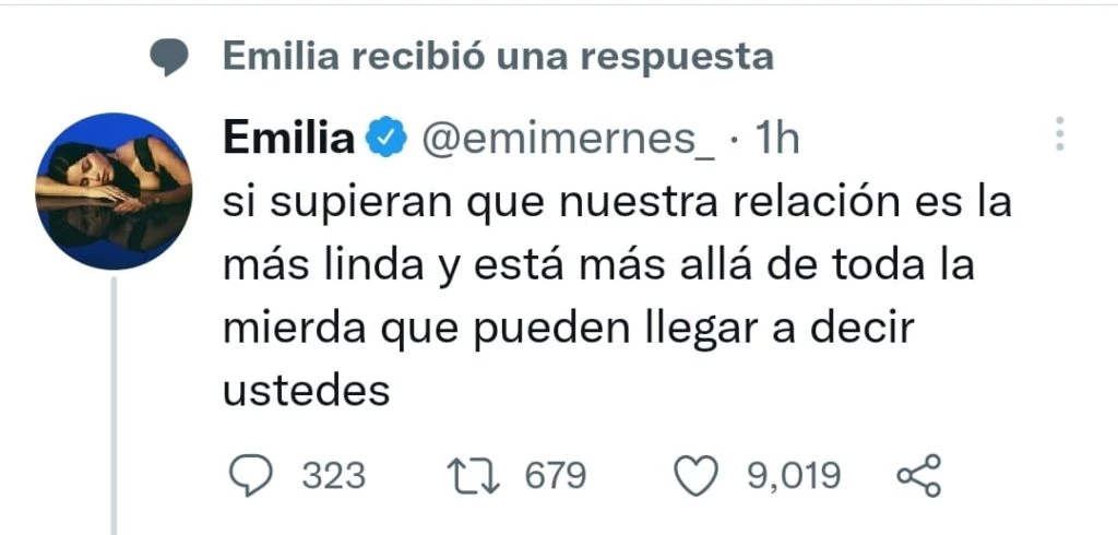 Pero esta vez, la cantante expresó un mensaje esta mañana, a través de su cuenta de Twitter en el que salió a aclarar ciertos rumores de aparentes haters por la relación que ella tiene con el trapero: "Si supiera que nuestra relación es la más linda y está más allá de toda la mierda que pueden llegar a decir ustedes", expresó Emilia en su Twitter.