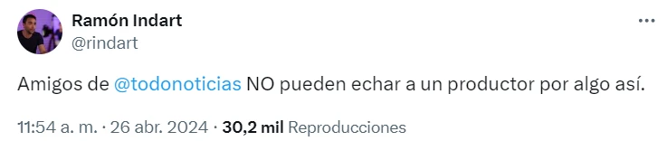 En tanto, Ramón Indart, de El Nueve, sumó: "Amigos de @todonoticias, no pueden echar a un productor por algo así". Y Sebastián Davidovsky, periodista de La Nación y Urbana Play, copió el mensaje y lo compartió también en sus redes.