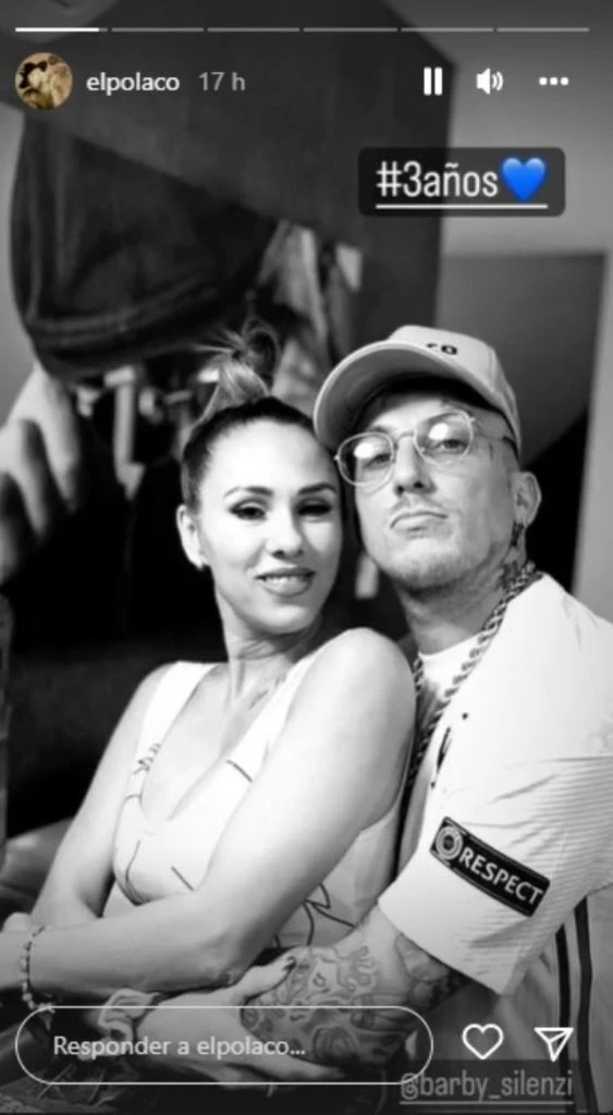 El cantante compartió una foto en las historias de Instagram, donde se lo puede ver posando junto a su novia y mamá de su hija pero lo que más impacto fue la polémica canción que eligió el artista, ya que eligió un tema bastante particular: "amor de manicomio" del artista Cusculluela. "3 años", dice el texto de la foto junto a un corazón azul.
