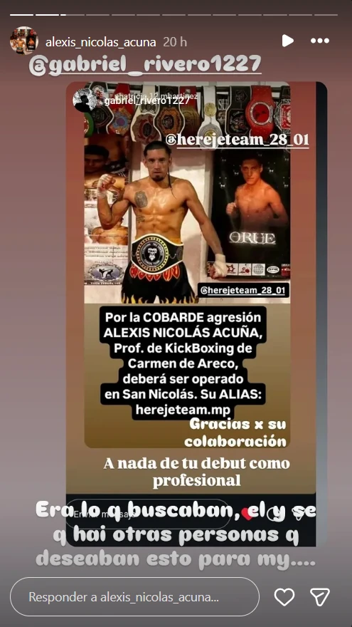 En sus redes, el luchador amateur compartió el mensaje de un amigo que deslizó esa sospecha: “No sé cómo hay gente que le puede cagar el sueño a esta gran persona”. Minutos después, él mismo reforzó esa idea al republicar otra frase: “Por la cobarde agresión, Alexis deberá ser operado en San Nicolás. A nada de su debut como profesional”.