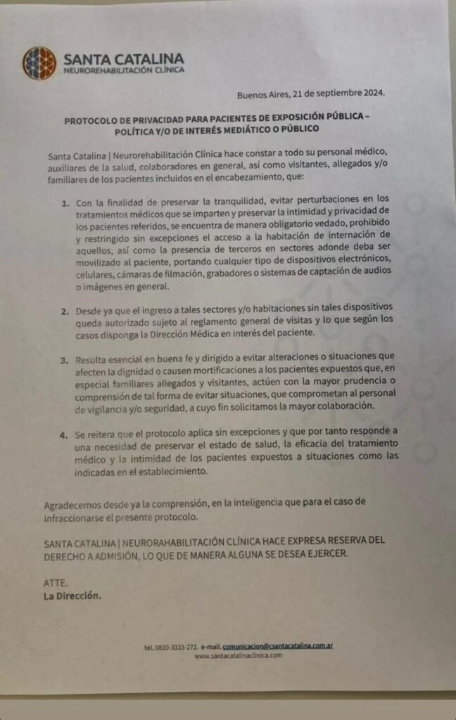 En horas de la tarde, su esposa Elba Marcovecchio compartió un documento con fecha de este 21 de septiembre, donde se detalla cuál es el "protocolo de privacidad" del centro médico en relación a los pacientes con exposicón o interés mediático, como es el caso del periodista.