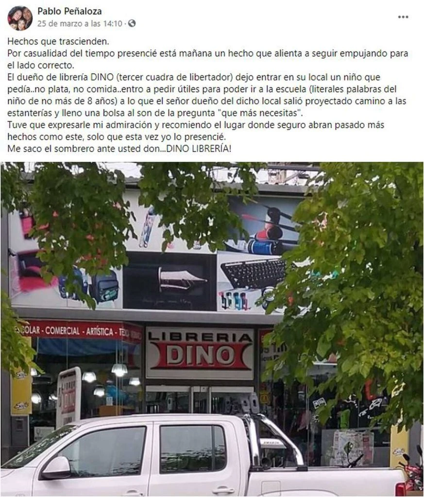 Este acto solidario conmovió no sólo al protagonista sino a un cliente, que fue testigo de la emotiva escena y decidió compartirla en las redes sociales. En pocas horas, la publicación se llenó de elogios para el dueño de la librería.