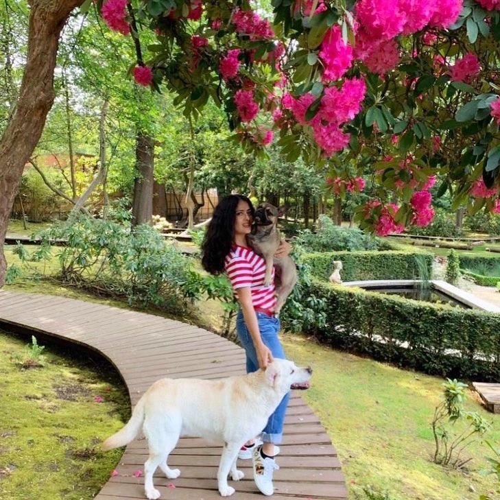 La China Suárez publicó esta foto en el invierno pasado. Se la ve feliz rodeada de sus amigos pichichos.