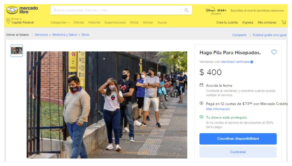 La nueva viveza criolla, una nueva changa, o alternativa de ingresos. En el lunfardo argentino también le llaman 'curro'. En Mercado Libre ofrecen el servicio "Hago Fila Para Hisopados" en medio de la tercera ola de coronavirus por la cepa Ómicron que ayer alcanzó los casi 100.000 casos positivos.
