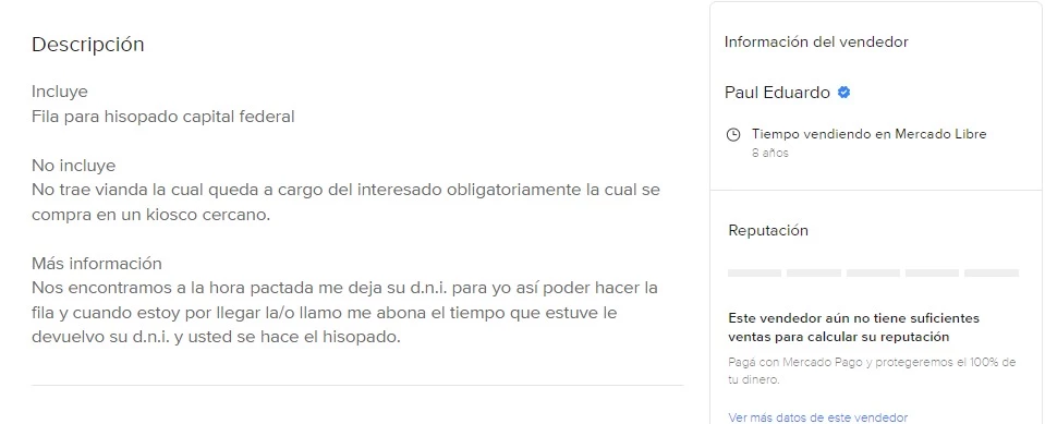 En la descripción del servicio de "Hago Fila Para Hisopados", el hombre dice "Incluye Fila para hisopado Capital Federal" y que lo que no incluye: "No trae vianda la cual queda a cargo del interesado obligatoriamente la cual se compra en un kiosco cercano".