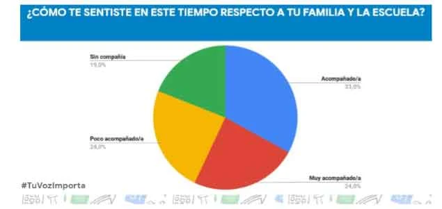 El 57% de los consultados manifestó sentirse “acompañado” o “muy acompañado” por su familia y la escuela. El 43 por ciento restante indicó sentirse “poco” o “nada acompañado”. Al mismo tiempo, un 14 por ciento de los encuestados valoró que muchos profesores y profesoras se hayan contactado para preguntarles cómo se sentían. En esa misma dirección, el 36 por ciento destacó el trabajo de adaptación de los docentes a esta nueva forma de dar clases, y otro 17 por ciento resaltó los esfuerzos que hacen para “mantenerlos enganchados” en las materias.