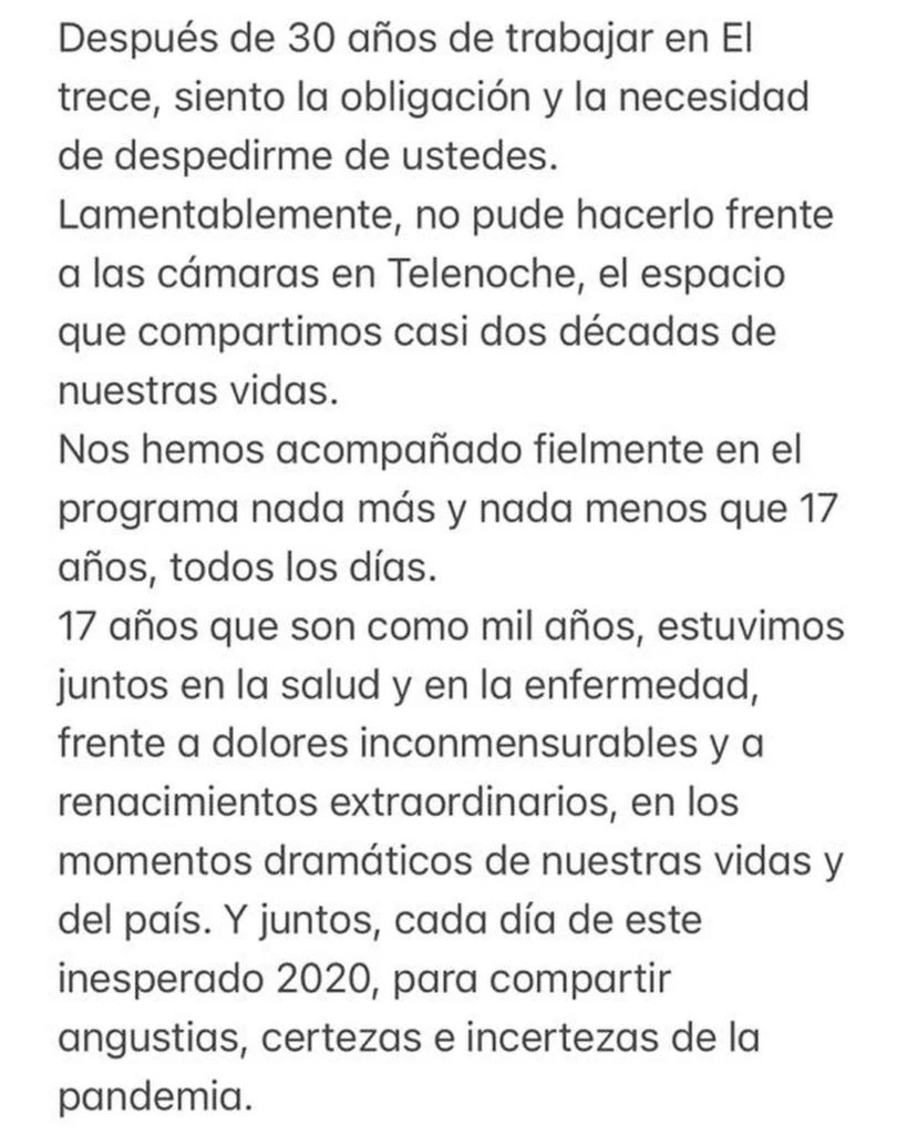 "Después de 30 años de trabajar en Eltrece, siento la obligación y la necesidad de despedirme de ustedes. Lamentablemente no pude hacerlo frente a las cámaras de Telenoche, el espacio que compartimos casi dos décadas de nuestras vidas. Nos hemos acompañado fielmente en el programa nada más y nada menos que 17 años, todos los días. 17 años que son como mil años, estuvimos juntos en la salud y en la enfermedad, frente a dolores inconmensurables y a renacimientos extraordinarios, en los momentos más dramáticos de nuestras vidas y del país. Y juntos, cada día de este inesperado 2020, para compartir angustias, certezas e incertezas de la pandemia", comenzó escribiendo Laura.