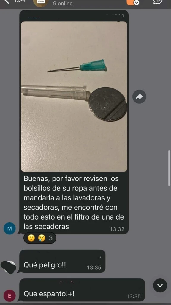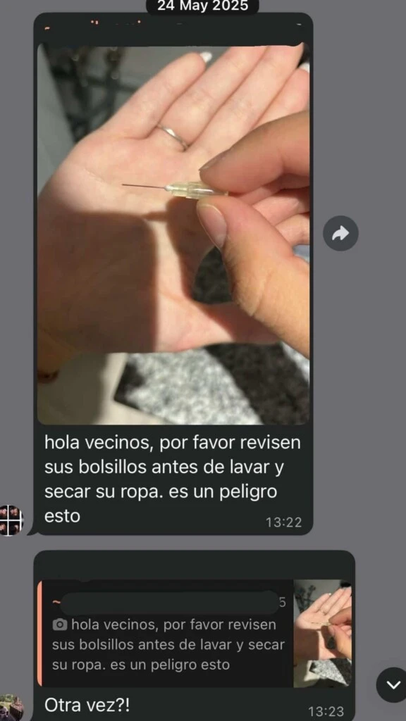 Según trascendió, lo que había encontrado eran agujas hipodérmicas en el laundry, un espacio de uso común del edificio. Tres días después, otra vecina reforzó el mensaje: “Por favor revisen antes de lavar y secar. Es un peligro esto”.