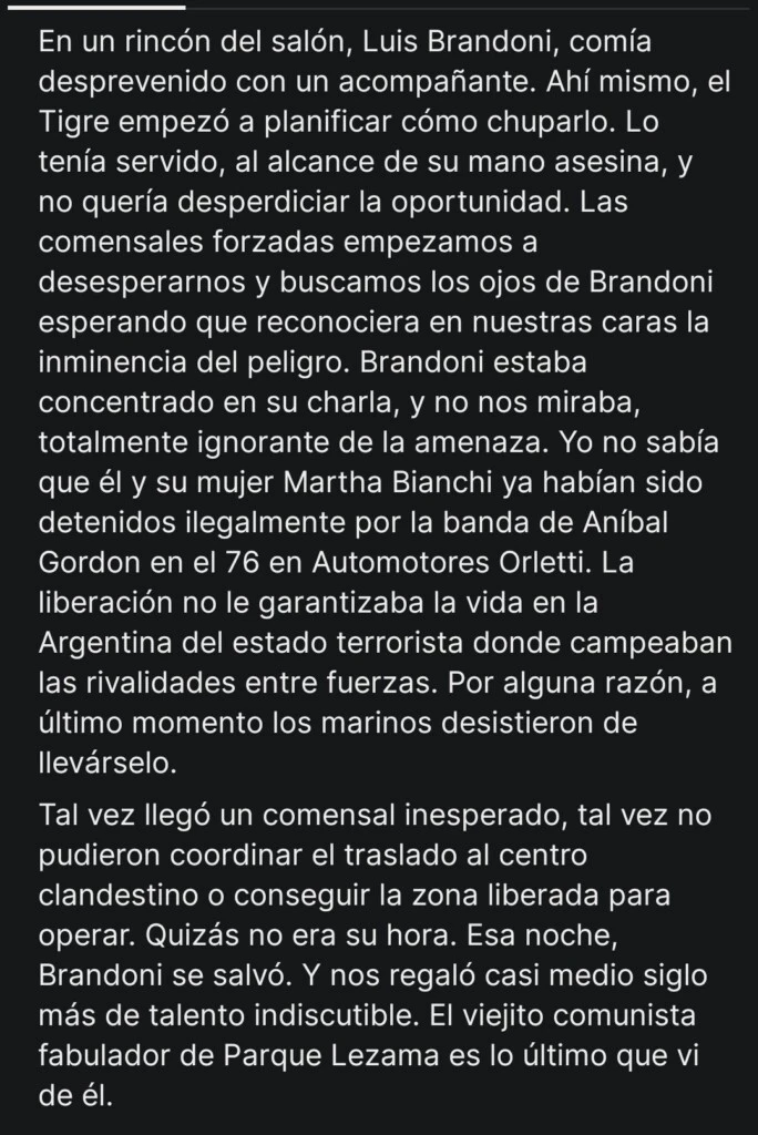 Brandoni salió del restaurante sin saber nada de lo ocurrido. No supo que había sido observado como objetivo. No supo que estuvo a segundos de desaparecer. Y vivió casi medio siglo más. “Esa noche, Brandoni se salvó. Y nos regaló casi medio siglo más de talento indiscutible”, escribió Lewin, en una frase que suena a balance histórico y también a despedida.