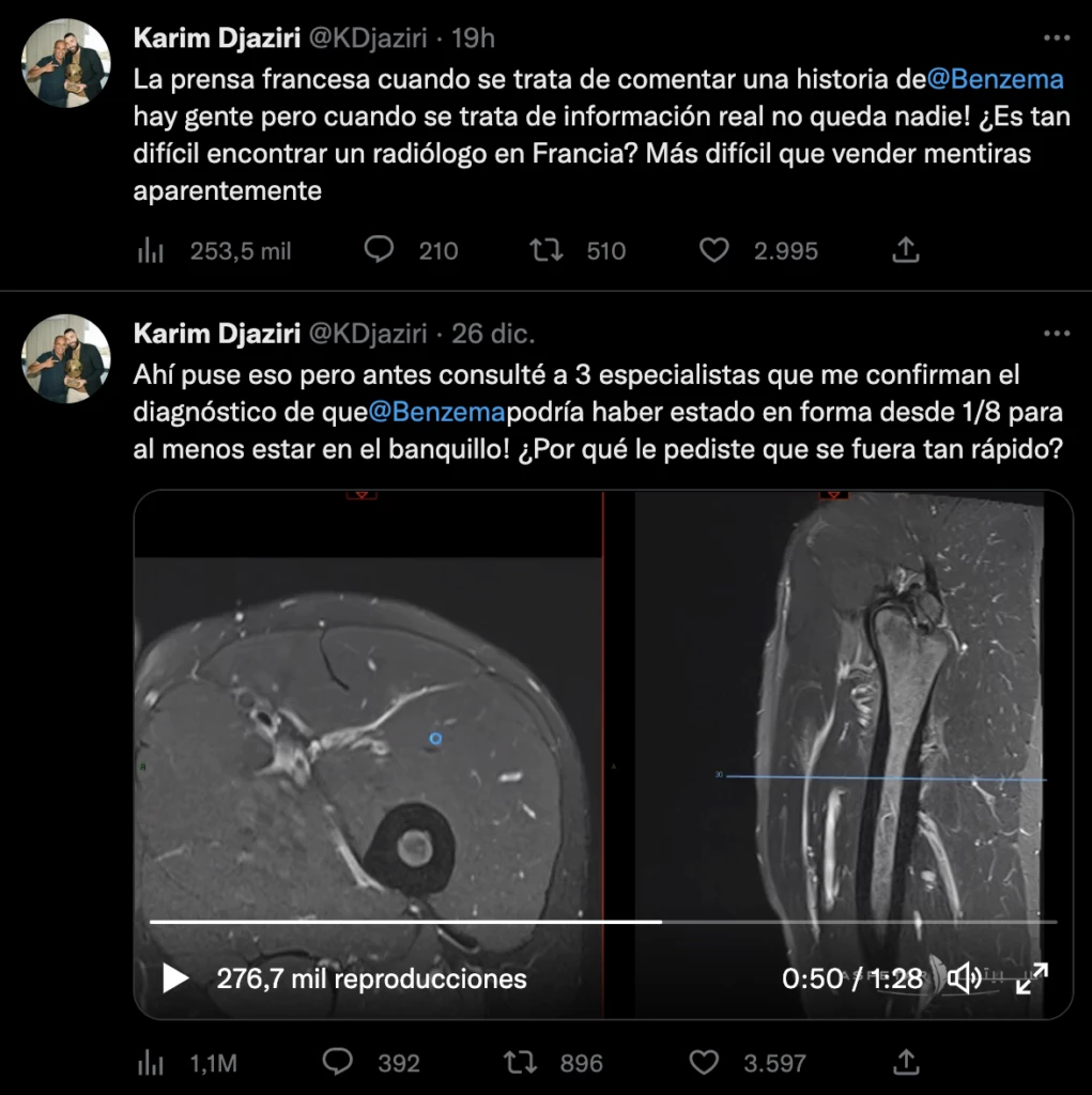 A través de sus redes sociales, Djaziri presentó los estudios de Karim Benzema y agregó: “¡Esto lo publico aquí, pero antes consulté a tres especialistas que me confirman el diagnóstico de que Benzema podría haber estado en forma desde los octavos de final para por lo menos estar en el banquillo! ¿Por qué le pediste que se fuera tan rápido?”, apuntó, sin mencionar al evidente destinatario, el citado DT francés Didier Deschamps.