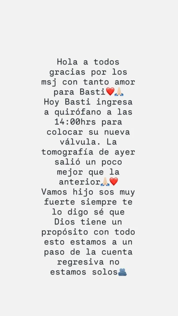 Luego, detalló el procedimiento al que sería sometido su hijo: “Hoy Basti ingresa a quirófano a las 14:00 horas para colocar su nueva válvula”. Se trata de una cirugía clave en medio del delicado cuadro que atraviesa el menor.