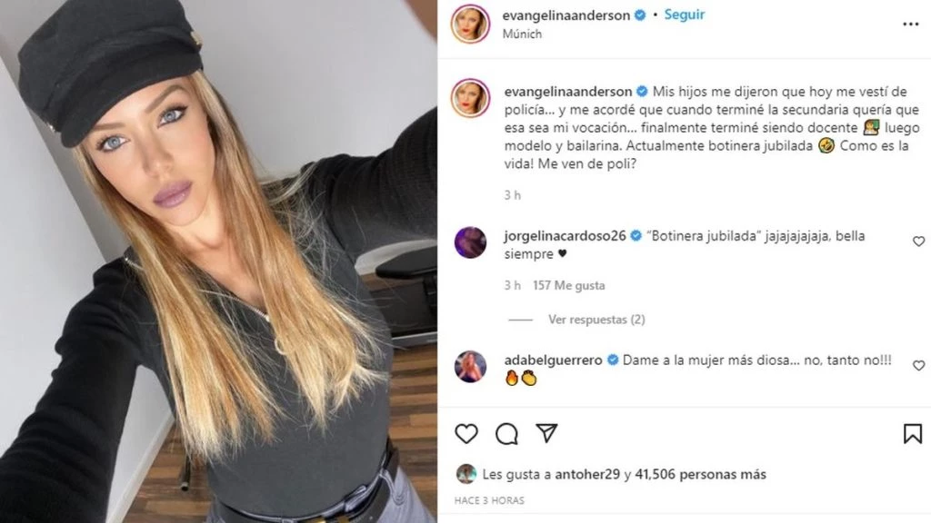 Evangelina Anderson sorprendió ayer a los seguidores que tiene en su cuenta personal de Instagram al confesar cuál era su verdadera vocación tras terminar el colegio secundario. Según escribió desde Múnich, Alemania, país donde vive hace años junto a su familia, quería ser policía.