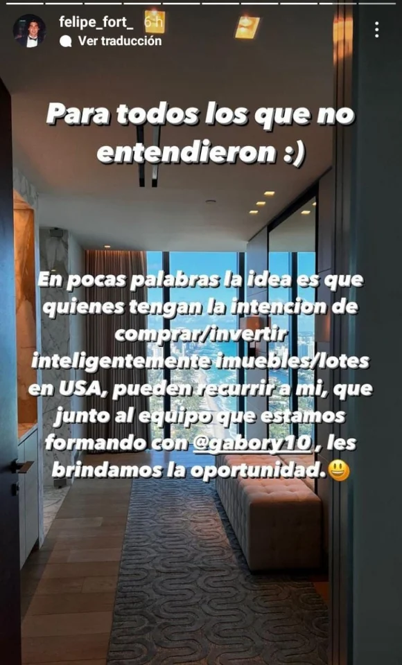 "La idea es que tengan la intención de comprar o invertir inteligentemente en inmuebles y lotes en USA...". Luego, escribió "Si quieren, pueden recurrir a mí y al equipo que estoy formando. Les brindamos la oportunidad", sumó Felipe promocionando su nueva alianza, con la que busca posicionarse en el negocio inmobiliario de Miami.
