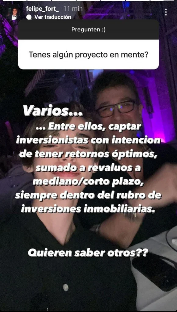 En este contexto, al hijo de Ricardo Fort le preguntaron qué proyectos tiene en mente y el joven contó que con su fortuna planea hacer varios negocios. "Quiero captar inversionistas con intención de tener retornos óptimos, siempre dentro del rubro de inversiones inmobiliarias", explicó a través de sus stories de Instagram.
