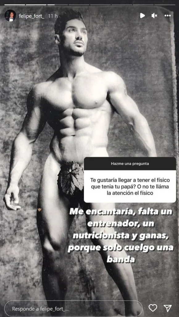 "Me encantaría. Falta un entrenador, un nutricionista y ganas porque solo cuelgo una banda", respondió sin dudarlo, Felipe Fort, asegurando que sin dudas le encantaría estar así de definido y tonificado como su padre, aunque el esfuerzo y las ganas, son lo que más le impiden dar el salto a conseguir un cuerpo así de definido como el comandante.