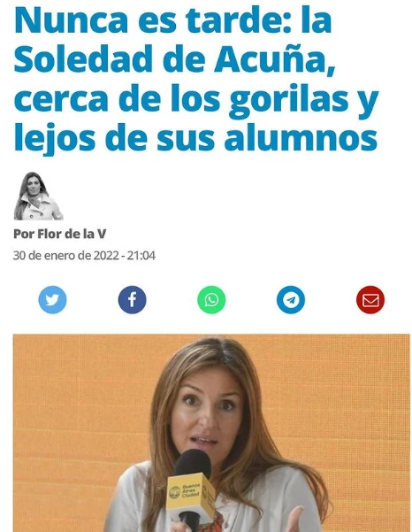 Ante esto, Flor de la V compartió parte de la columna que escribió para Página 12 en donde repudia los dichos de la funcionaria pública: "Estamos ingresando al mes del comienzo de clases y me parece importante reflexionar sobre los dichos racistas y discriminatorios que expresó la ministra de Educación, Soledad Acuña. A mí no me sorprendieron, la señora Acuña nos tiene acostumbrados a declaraciones polémicas"
