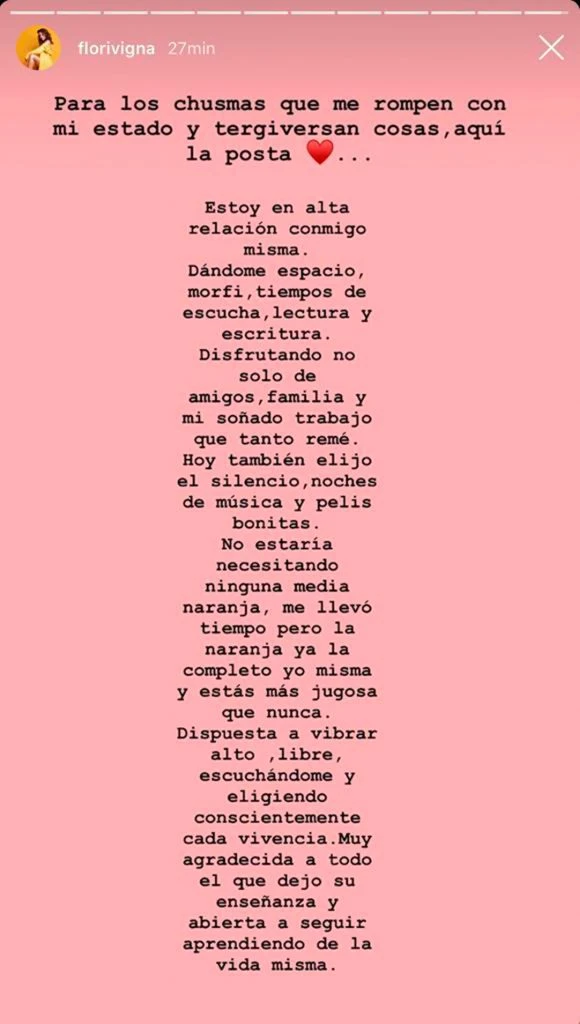 “Para los chusmas que me rompen con mi estado y tergiversan cosas, aquí la posta. Estoy en alta relación conmigo misma. Dándome espacio, morfi, tiempos de escucha, lectura y escritura. Disfrutando no solo de amigos, familia y mi soñado trabajo que tanto remé. Hoy también elijo el silencio, noches de música y pelis bonitas“. comienza diciendo por entonces.