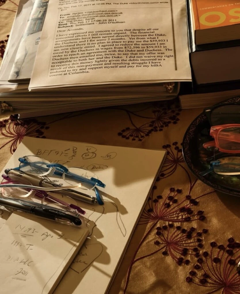 Les he expresado mi preocupación de que, a pesar de todos nuestros esfuerzos concertados, sigo sin recibir el pago. Los acuerdos financieros fueron pactados directamente entre el Duque, la Duquesa y yo durante unos 2 meses. Sin embargo, por lo que entiendo, no existe ningún plan establecido para pagarme los $59,933 que ahora se me deben claramente. Acepté reducir la cantidad que me deben la Duquesa en concepto de salarios de $72,596 a $59,933 para llegar a un acuerdo con el Duque y la Duquesa. Posteriormente, la Duquesa me envió un correo electrónico, dos veces, indicando que mi oferta era aceptable tanto para ella como para el Duque. No renuncio a mi derecho a recibir este dinero a la ligera, dados los compromisos económicos en los que incurrí como resultado de este impago y la sostenida lucha que he soportado para intentar mantenerme y pagar mi curso de MBA en Columbia".