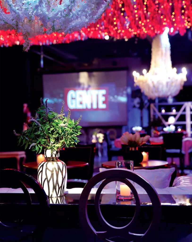 La música estuvo a cargo de los Djs de Bonjour Berlin, quienes hicieron bailar a los invitados sobre la pista de leds que destellaban la palabra GENTE bajo un techo con cinco mil luces en juego con papeles metálicos. Cerró la fiesta Output Djs by Martín Lamelas. Las mesas altas con banquetas eran estilo Capri y los floreros de Muy Arzuaga.
