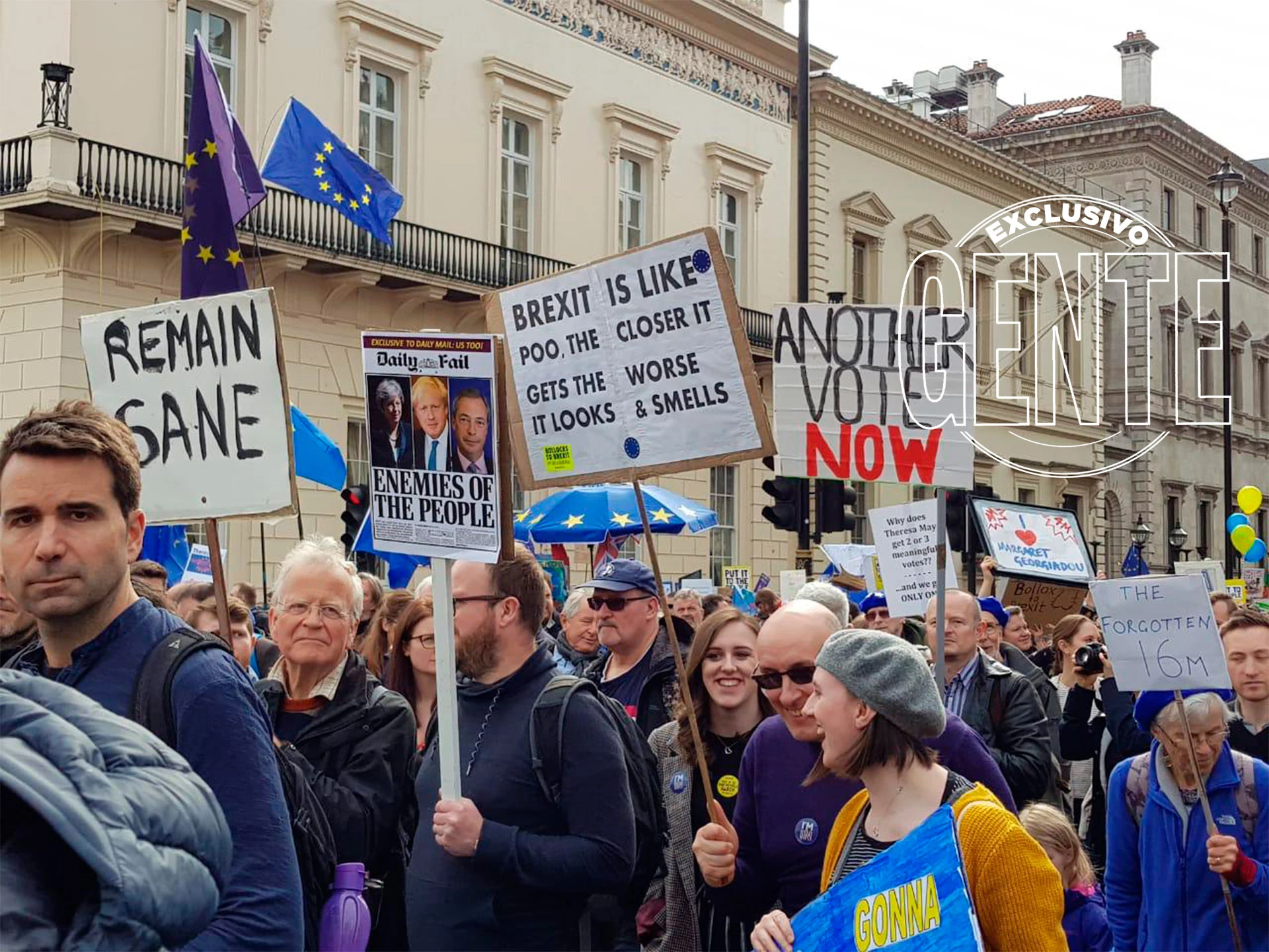 Los manifestantes, sin eufemismos: "El brexit es como la m... Más cerca está, peor luce y huele". Foto: Revista GENTELa columna de Nelson, en Trafalgar Square, testigo de la marcha y la vigilancia policial. Foto: Revista GENTEUn francés también marchó en apoyo a la continuidad británica en la Unión Europea. Foto: Revista GENTENada impidió a esta mujer pedir que se vuelva a votar el referéndum para que el Brexit no se consume. Foto: Revista GENTENadie quedó fuera de la convocatoria. También las mascotas estuvieron presentes. Foto: Revista GENTE"Mejor con el Euro", dice el cartel. La salida de Gran Bretaña de la Unión Europea supondría un perjuicio económico para las islas. Foto: Revista GENTE"Soy europeo", reza la pancarta. Un millón de personas marcharon contra el Brexit. Foto: Revista GENTEMuchos pidieron por la renuncia de la primer ministra Theresa May antes de abril, cuando podría darse la salida de Gran Bretaña de la Unión Europea. Foto: Revista GENTE"Bollocks to Brexit. It's not a done deal" fue una de las duras consignas. La traducción literal sería: "Brexit, las pelotas. El trato no está hecho". Foto: Revista GENTELa política latinoamericana también se coló en la marcha. Aquí, un mensaje de apoyo a Lula Da Silva. Foto: Revista GENTEUn millón de personas marchó en Londres contra el Brexit. Aquí, un cartel que hizo mención a la situación en Venezuela. Foto: Revista GENTEUn millón de personas marcharon hasta la Cámara de los Comunes para pedir la continuidad británica en la Unión Europea. Foto: Niklas HALLE'N / AFP