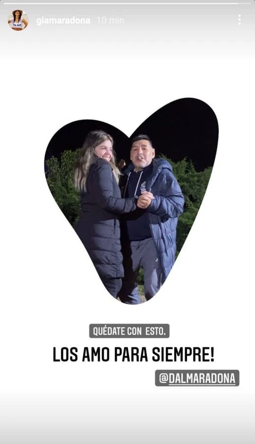 Junto a una foto de Diego tomando a Dalma de las dos manos como si estuviera bailando con ella adentro de un corazón, Gianinna escribió "Quedate con esto. Los amo para siempre" y arrobó a su hermana, quien fue la primera en dar la cara a las pocas horas después de que pasó lo que pasó.