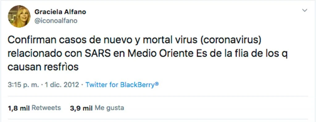 Y en medio de este contexto de alerta y preocupación, salió a la luz un tuit de Graciela Alfano de 2012 en el que hace mención al coronavirus.