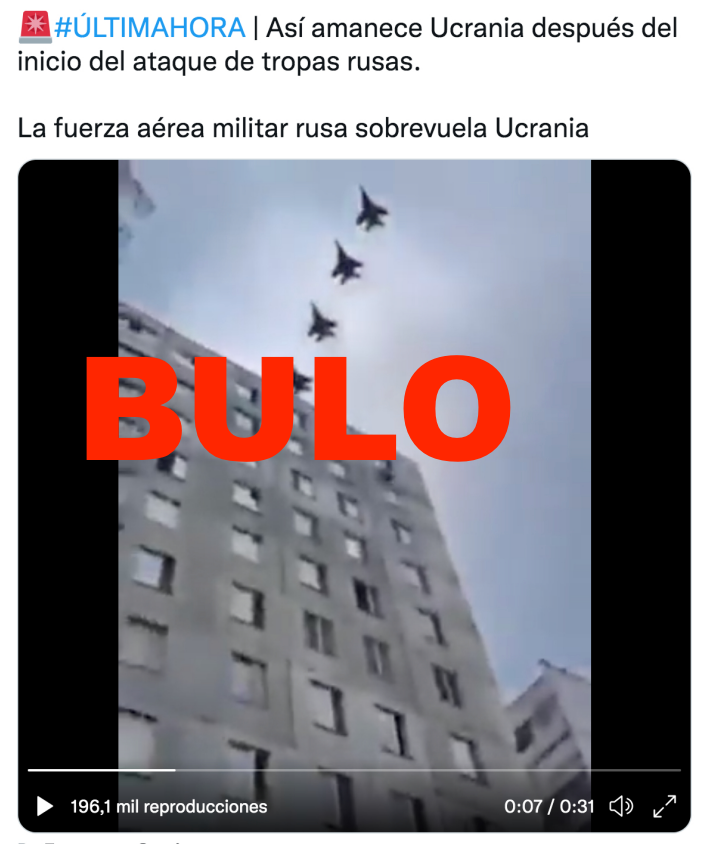 El jueves, se compartió a través redes sociales un video en el que se puede ver una gran cantidad de aviones volando a baja altura sobre una ciudad. Las publicaciones indican que las imágenes habían sido tomadas recientemente en Ucrania. Pero esto según Chequeado esto es falso: fue grabado en 2020 en Rusia.