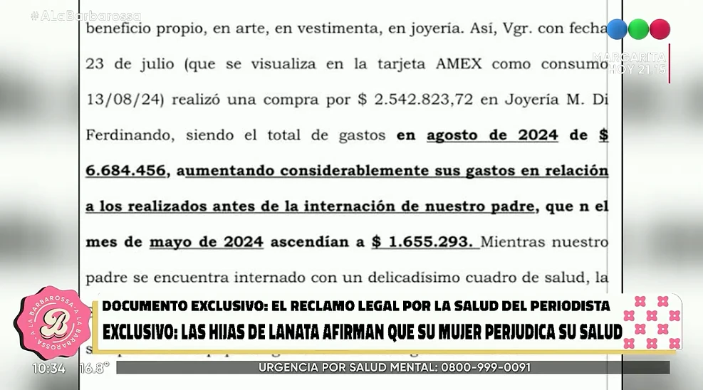 "Esto demuestra el quiebre total que hay en la relación realmente", afirmó la panelista de A la Barbarossa. Luego, reveló: "Dice que se gastó 2.542.823,72 en una joyería, siendo el total de gastos en agosto de 2024 de 6.684.456. Esto está documentado".