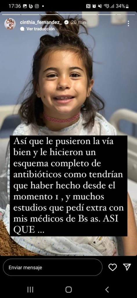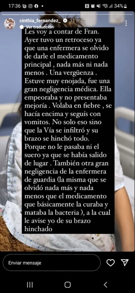 "Les voy a contar de Fran. Ayer tuvo un retroceso ya que una enfermera se olvidó de darle el medicamento principal, nada más ni nada menos. Una vergüenza. Estuve muy enojada, fue una gran negligencia médica. Ella empeoraba y no presentaba mejoría. Volaba en fiebre, se hacía encima y seguía con vomitos. No solo eso sino que la vía se infiltró y su brazo se hinchó todo, porque no le pasaba ni el suero que se le había salido de lugar", comenzó diciendo sobre la atención que recibió la niñita en el exterior.