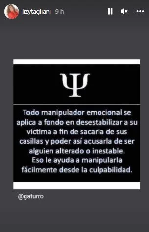 Después de la nota de Leo en LAM, Lizy hizo un llamativo posteo en Instagram Stories. "Todo manipulador emocional se aplica a fondo en desestabilizar a su víctima a fin de sacarla de sus casillas y poder acusarla de ser alguien alterado o inestable", decía el posteo. "Eso le ayuda a manipularla fácilmente desde la culpabilidad", expresa la reflexión que compartió Lizy a través de sus stories de Instagram.