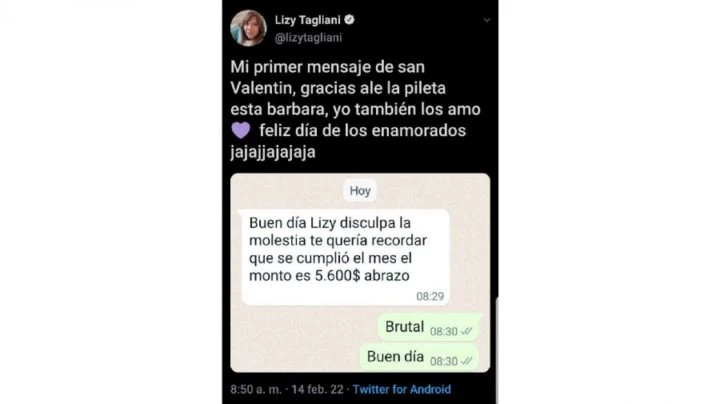 “Mi primer mensaje de San Valentín, gracias Ale, la pileta esta bárbara, yo también los amo. Feliz día de los enamorados jajajjajajaja”, escribió en un primer momento Lizy, y adjuntó la foto que capturó la pantalla de la conversación: “Buen día Lizy, disculpá la molestia. Te quería recordar que se cumplió el mes, el monto es $5600. Abrazo”.