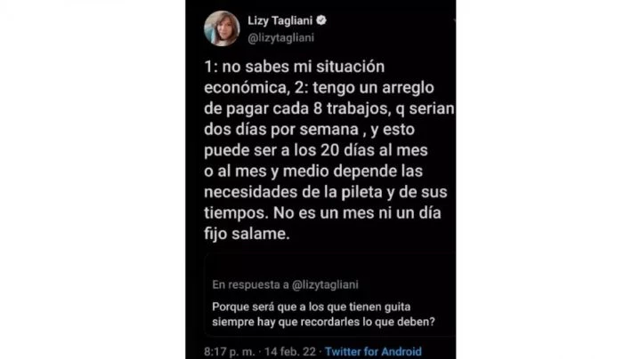 Tagliani no dejó la conversación ahí, recogió el guante y le escribió: "1: No sabés mi situación económica, 2: Tengo un arreglo de pagar cada 8 trabajos, que serian dos días por semana, y esto puede ser a los 20 días al mes o al mes y medio, depende las necesidades de la pileta y de sus tiempos. No es un mes ni un día fijo, salame”.