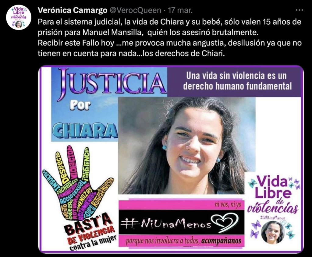 "Para el sistema judicial, la vida de Chiara y su bebé, sólo valen 15 años de prisión para Manuel Mansilla, quién los asesinó brutalmente. Recibir este fallo hoy ...me provoca mucha angustia, desilusión, ya que no tienen en cuenta para nada...los derechos de Chiari", expresó en un crudo e indignante descargo Verónica Camargo, tras conocer el fallo de la Justicia santafesina.